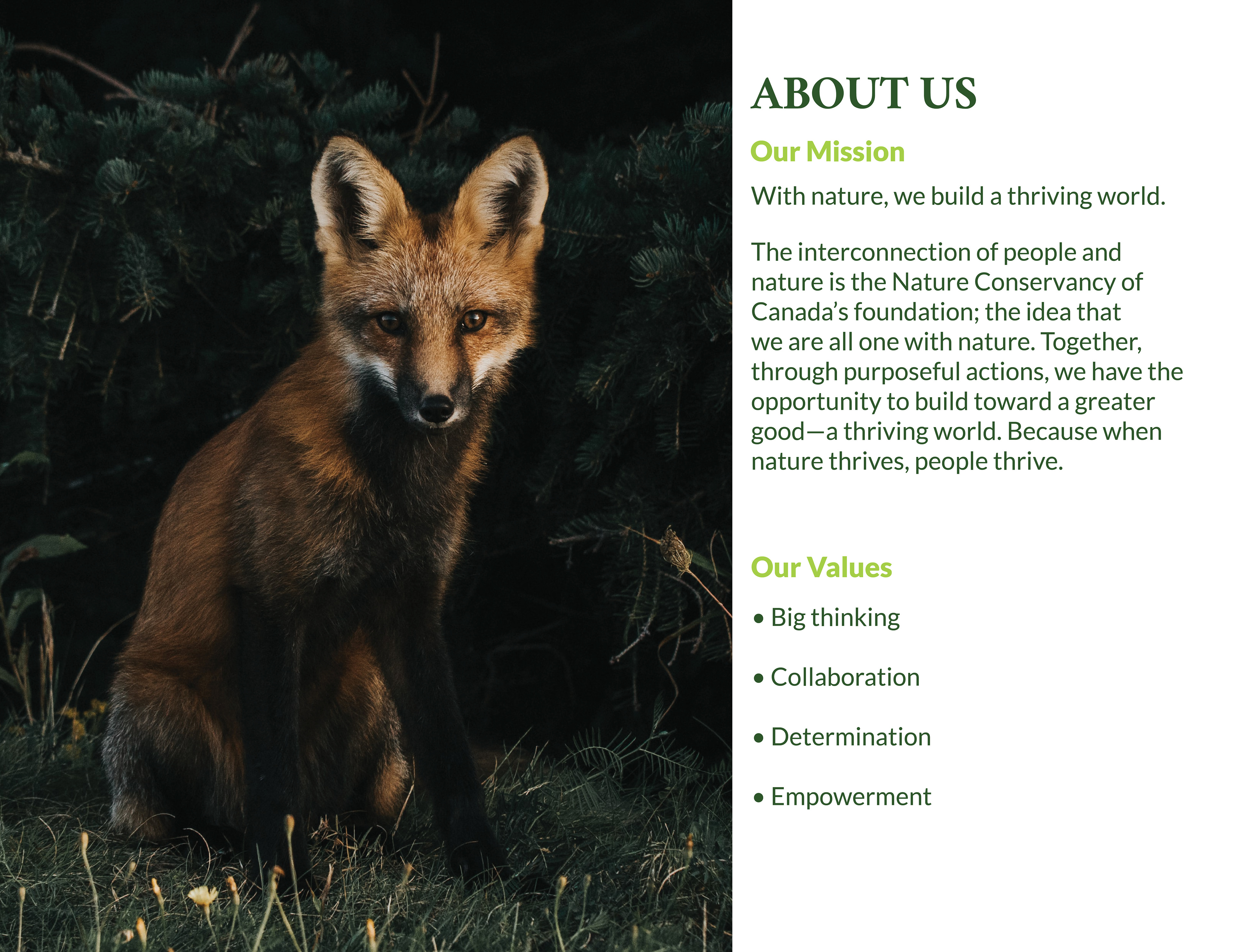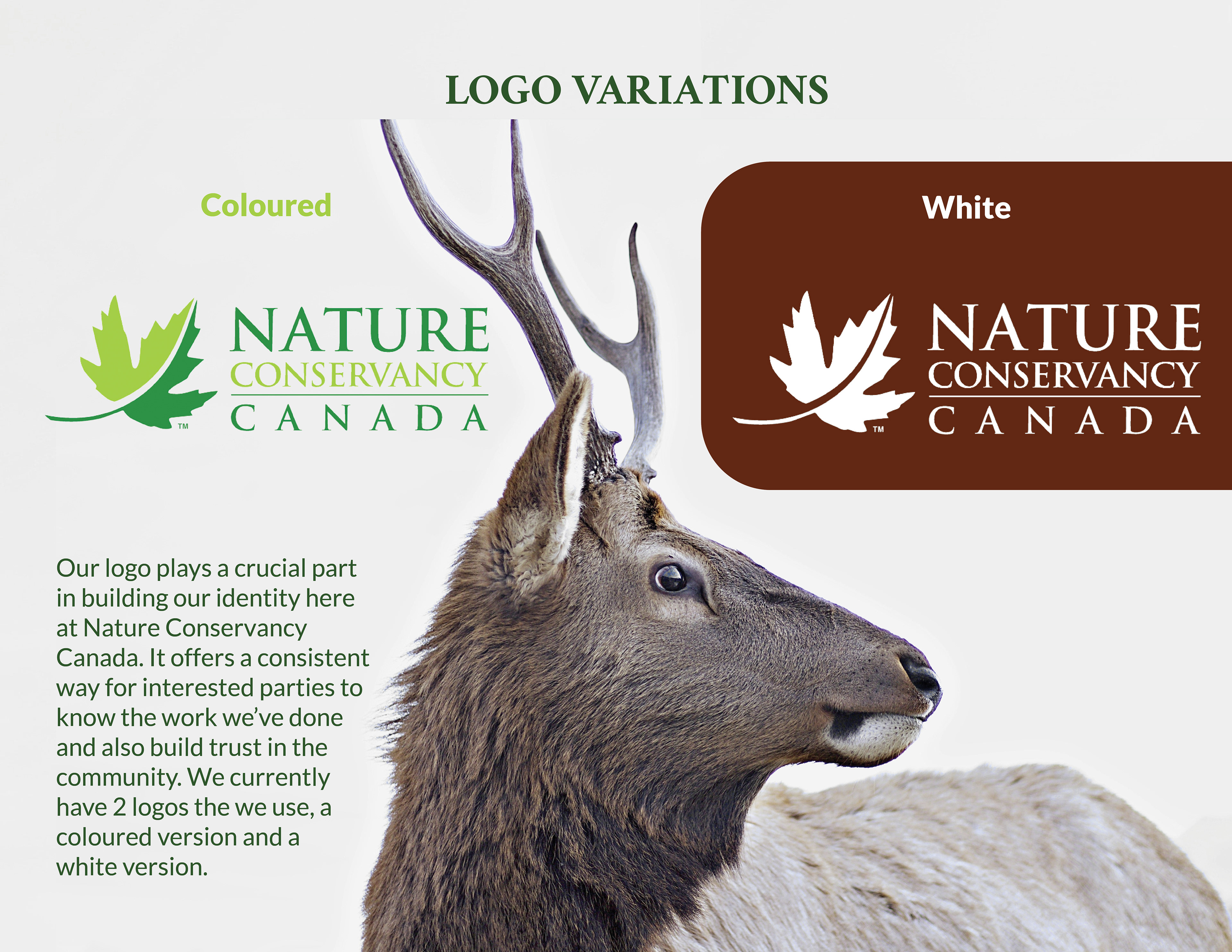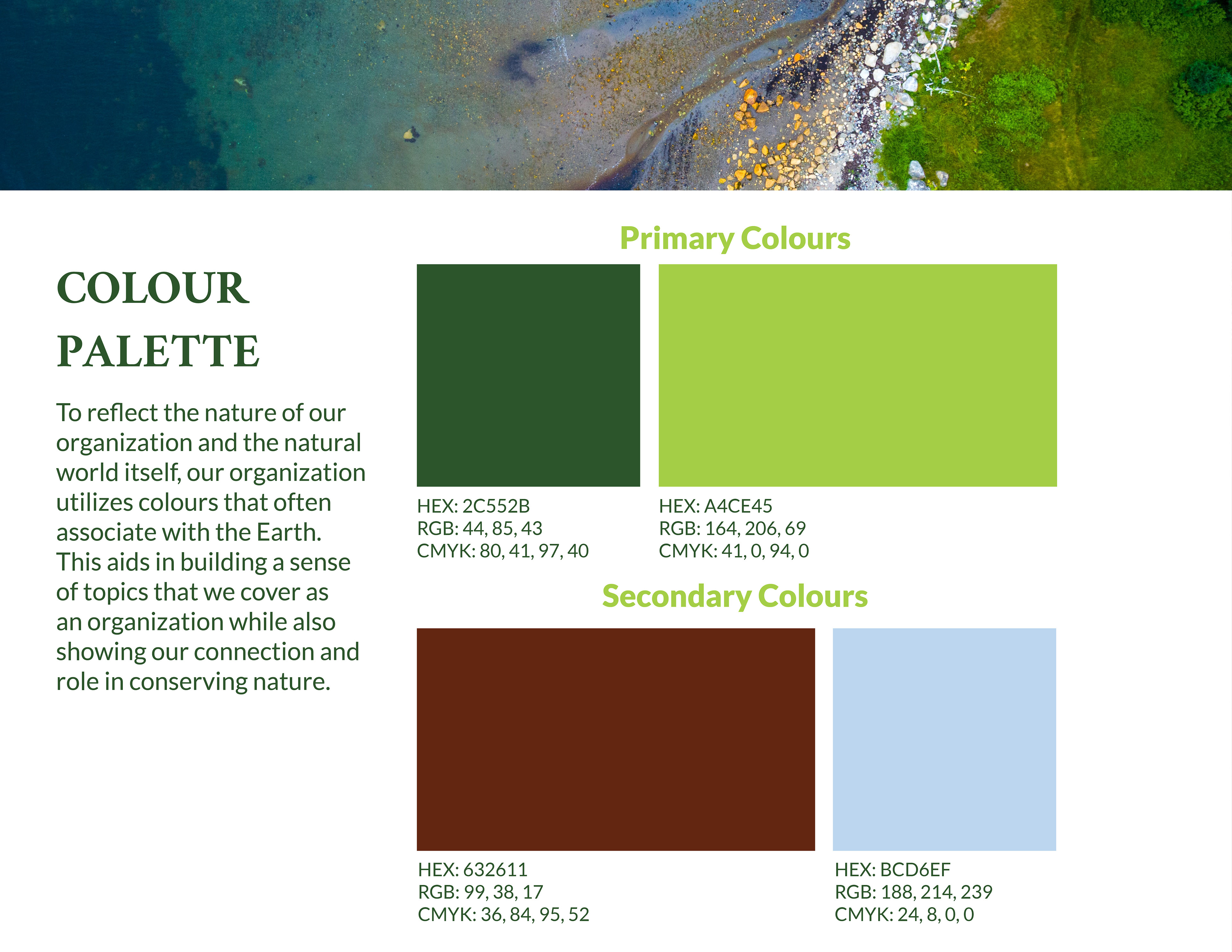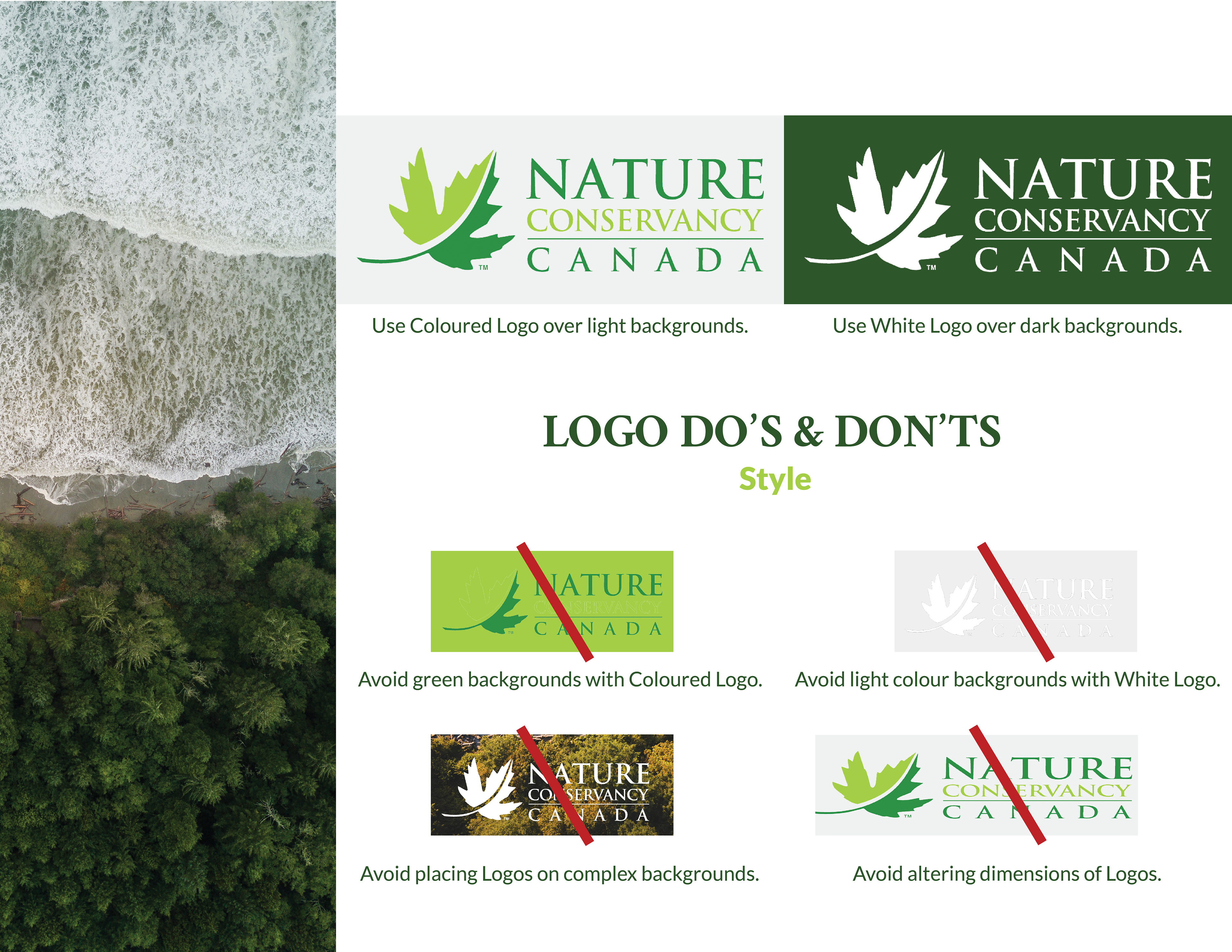 Created as an assignment for the Environmental Visual Communications program, the following Brand Guideline aims to provide employees of the Nature Conservancy of Canada with clear and concise ways to present their brand in any future work.